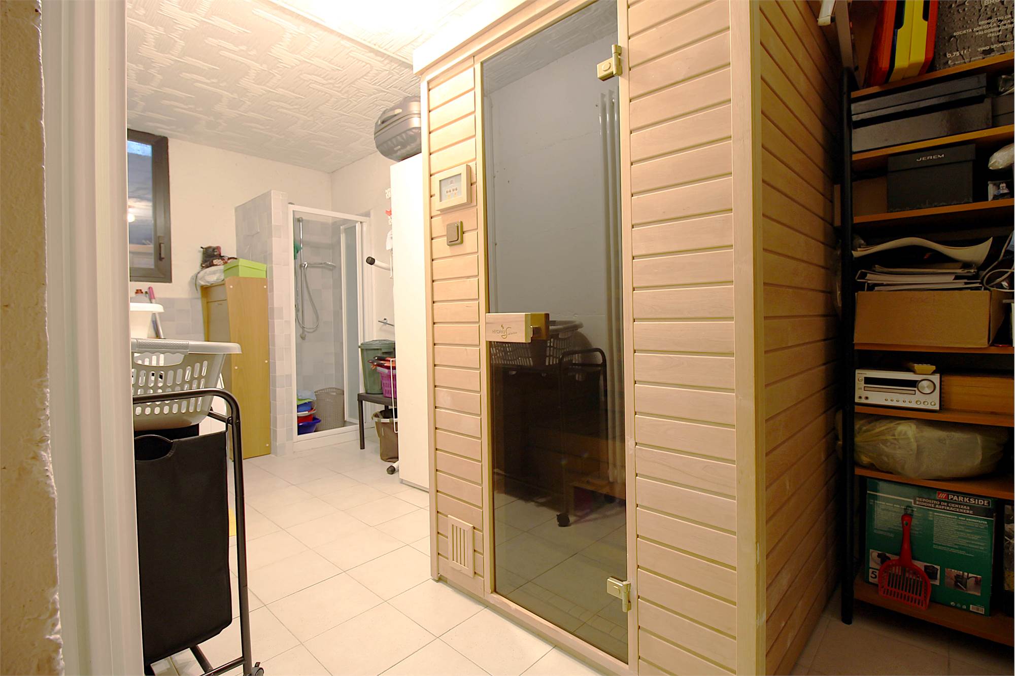 Al piano seminterrato si sviluppa una spaziosa taverna con camino, perfetta come area relax e convivialità, arricchita da bagno con sauna, creando un’autentica zona benessere privata.